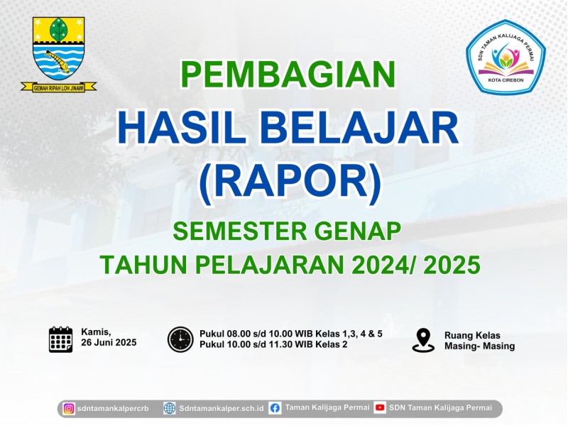 Cirebon – Seiring dengan berakhirnya kegiatan belajar mengajar di semester genap, SDN Taman Kalijaga Permai dengan gembira mengundang seluruh orang tua/wali murid untuk menghadiri acara pembagian hasil belajar (rapor) untuk Tahun Ajaran 2024/2025.